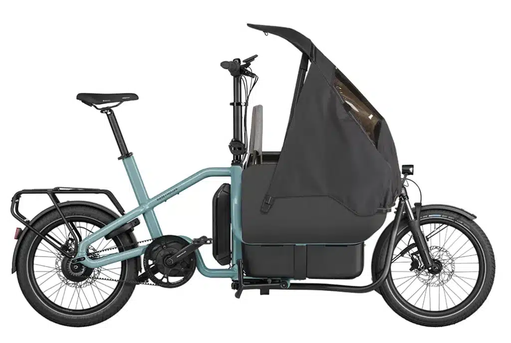 Si tienes hijos, considera la Flex Box con silla infantil. La capota infantil asegura que los pequeños pasajeros estén protegidos del viento y la lluvia. (Adecuado para dos niños como máximo hasta los siete años. Consulta la normativa de tu país sobre el transporte de niños antes de su uso y respétala).